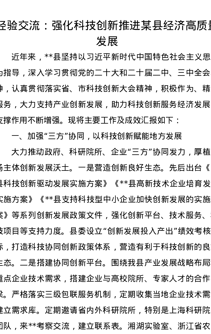 经验交流:强化科技创新 推进某县经济高质量发展