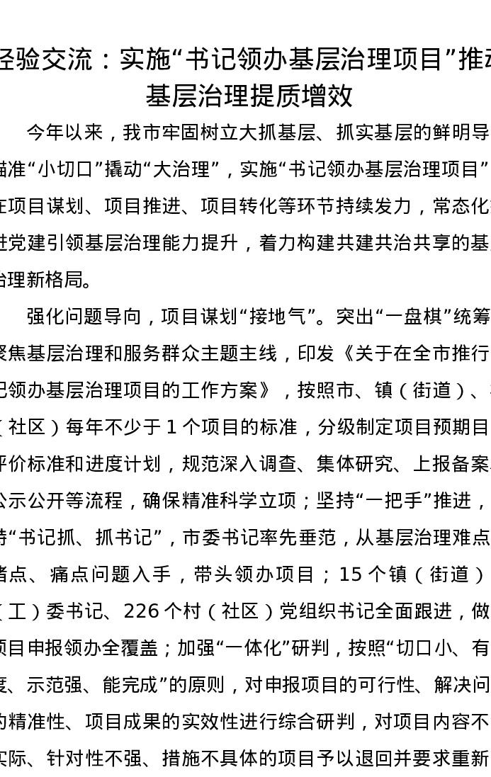 经验交流:实施“书记领办基层治理项目”推动基层治理提质增效