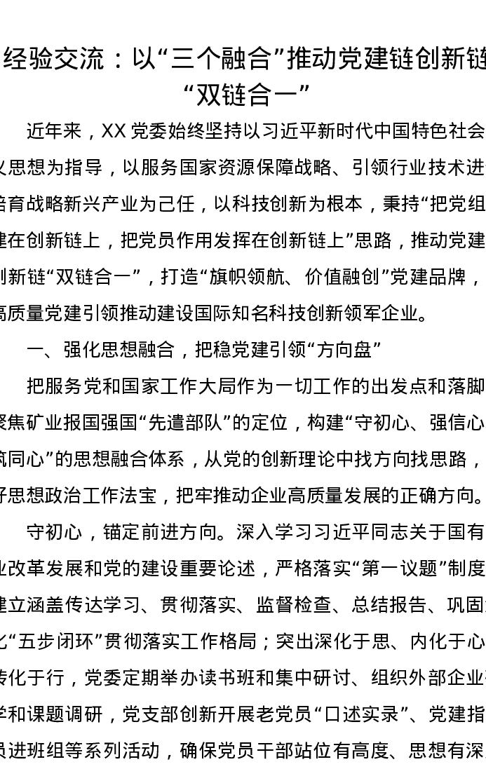 经验交流:以“三个融合” 推动党建链创新链“双链合一”