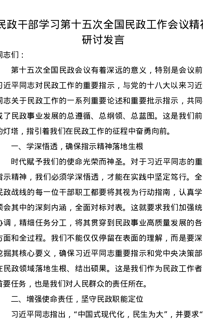 民政干部学习第十五次全国民政工作会议精神研讨发言