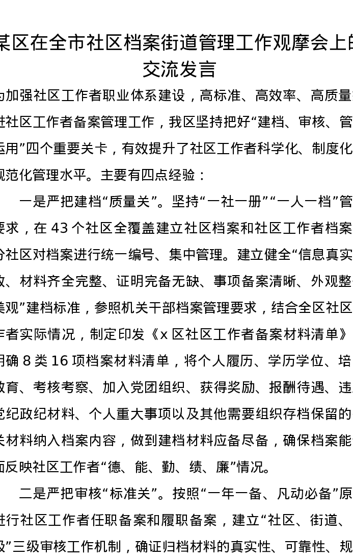 某区在全市社区档案街道管理工作观摩会上的交流发言
