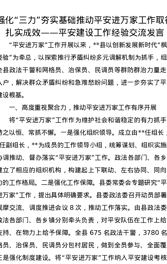 强化“三力”夯实基础 推动平安进万家工作取得扎实成效——平安建设工作经验交流发言
