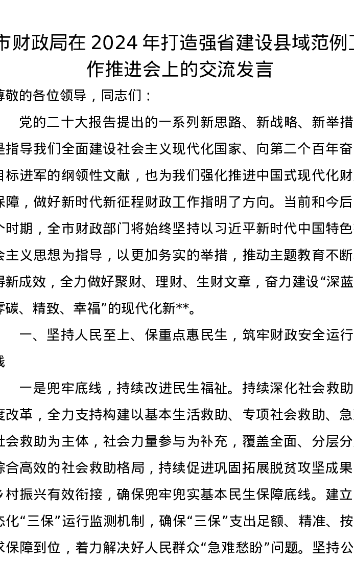 市财政局在2024年打造强省建设县域范例工作推进会上的交流发言