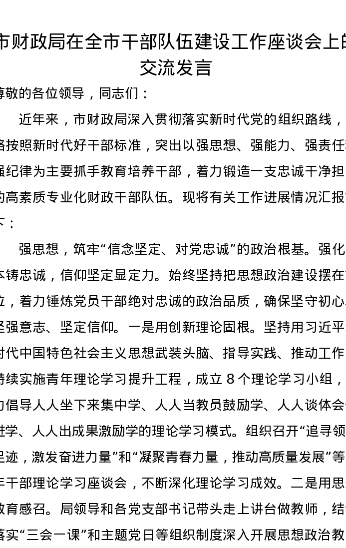 市财政局在全市干部队伍建设工作座谈会上的交流发言