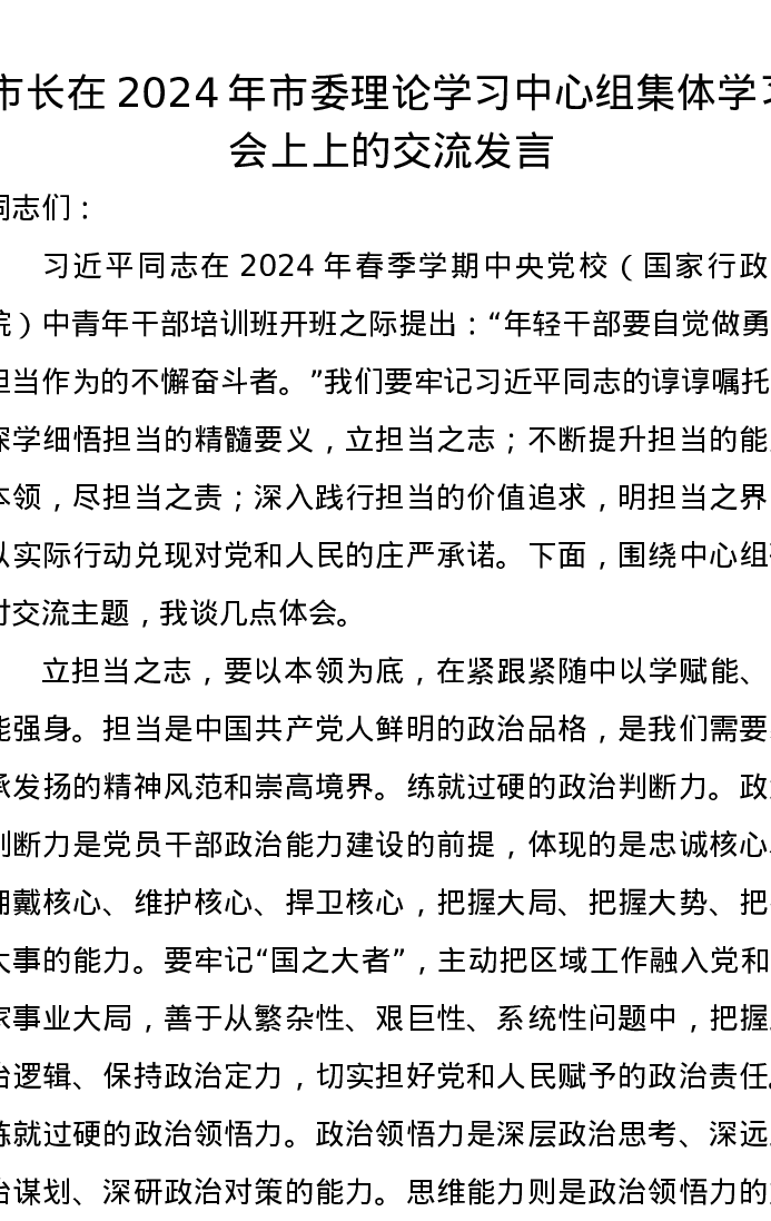 市长在2024年市委理论学习中心组集体学习会上上的交流发言