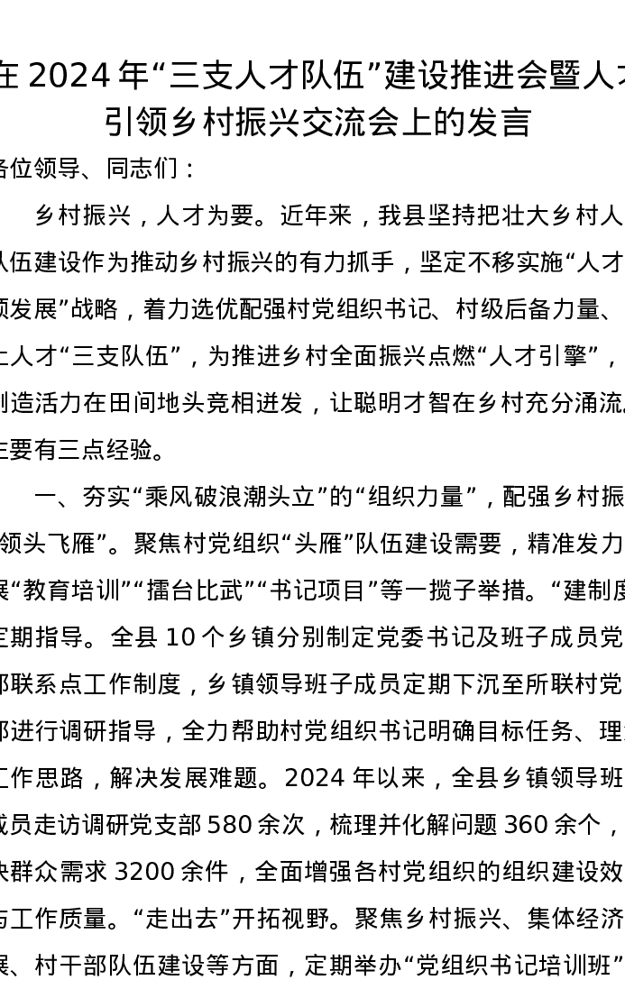 在2024年“三支人才队伍”建设推进会暨人才引领乡村振兴交流会上的发言