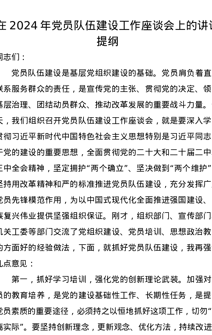 在2024年党员队伍建设工作座谈会上的讲话提纲