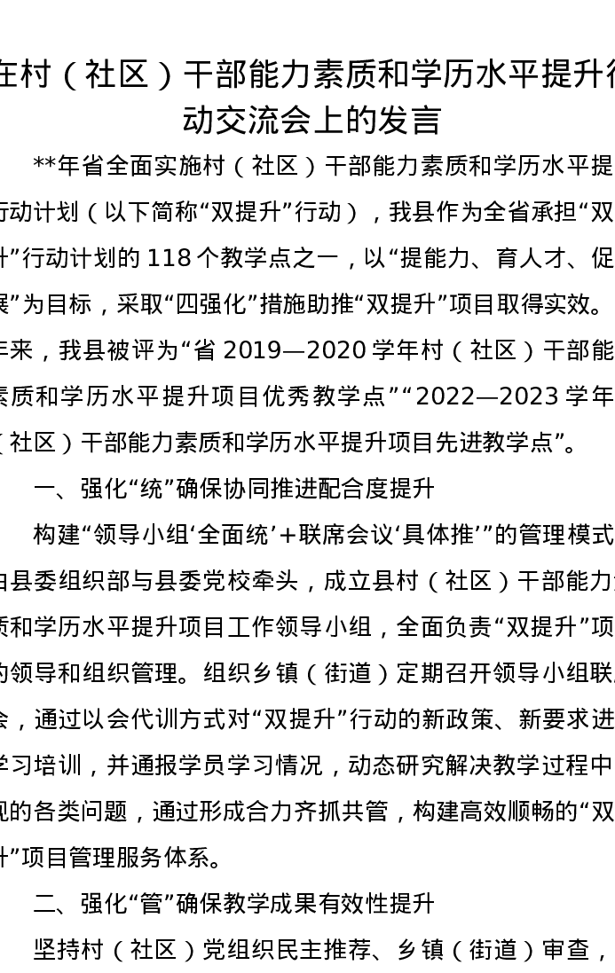 在村(社区)干部能力素质和学历水平提升行动交流会上的发言