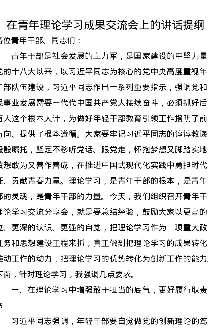 在青年理论学习成果交流会上的讲话提纲