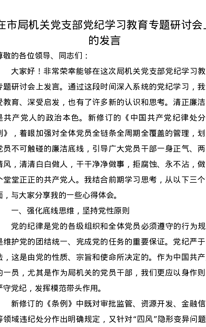 在市局机关党支部党纪学习教育专题研讨会上的发言