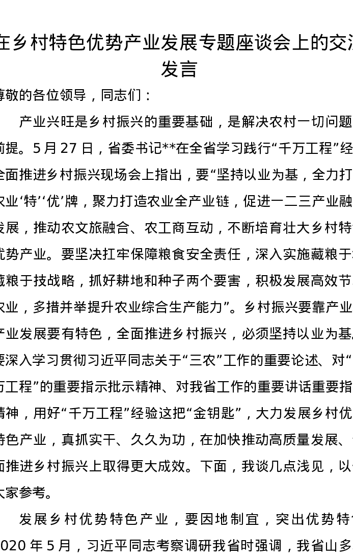 在乡村特色优势产业发展专题座谈会上的交流发言
