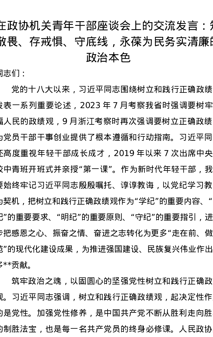 在政协机关青年干部座谈会上的交流发言:知敬畏、存戒惧、守底线,永葆为民务实清廉的政治本色