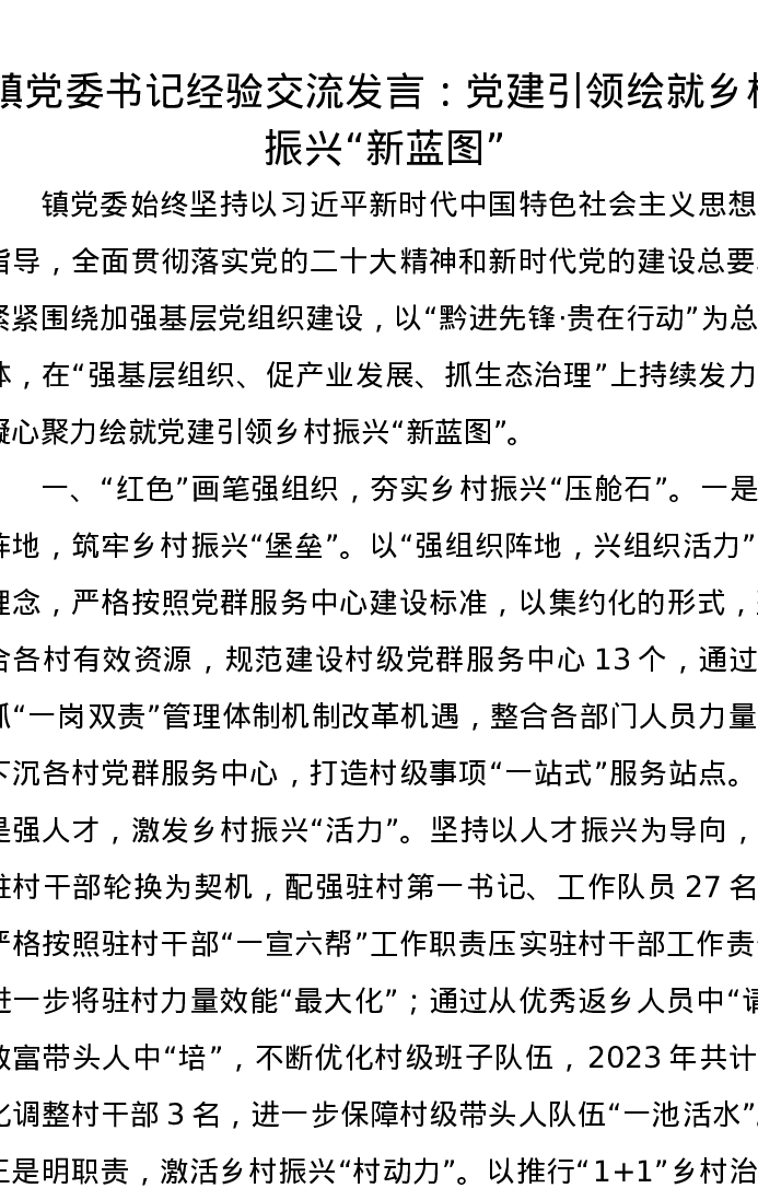 镇党委书记经验交流发言:党建引领绘就乡村振兴“新蓝图”