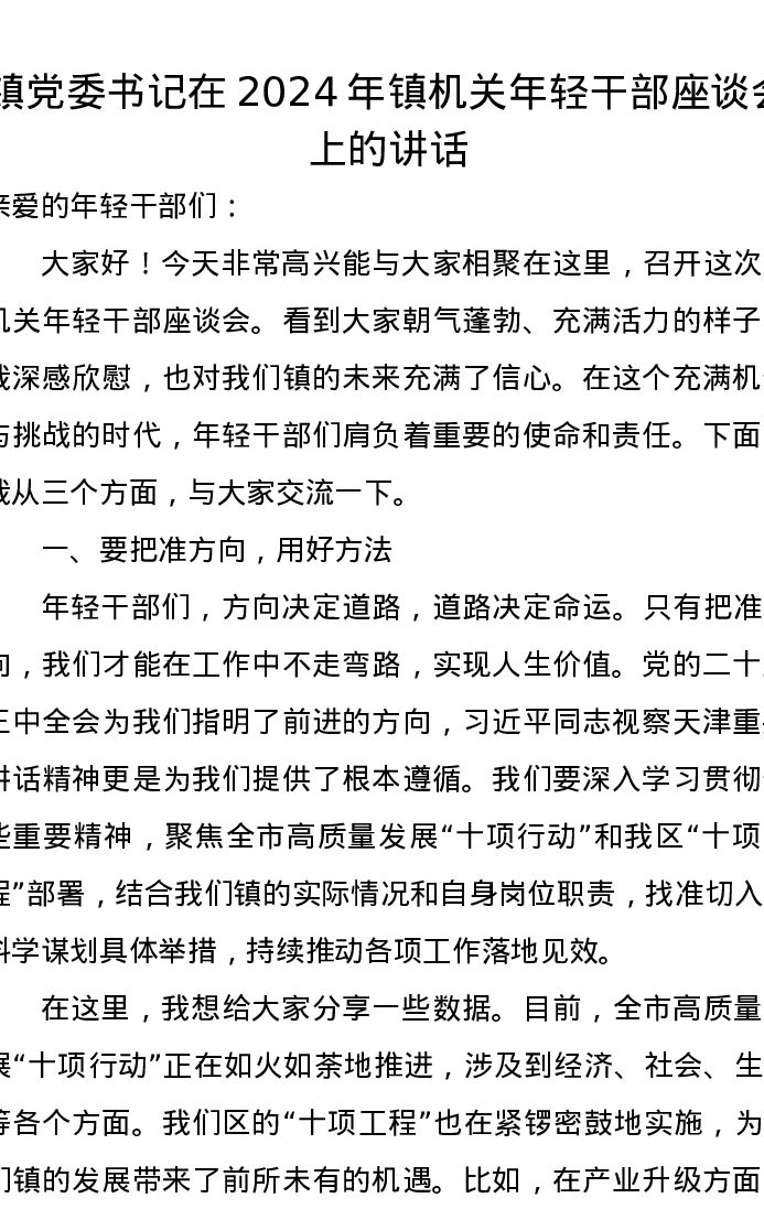 镇党委书记在2024年镇机关年轻干部座谈会上的讲话