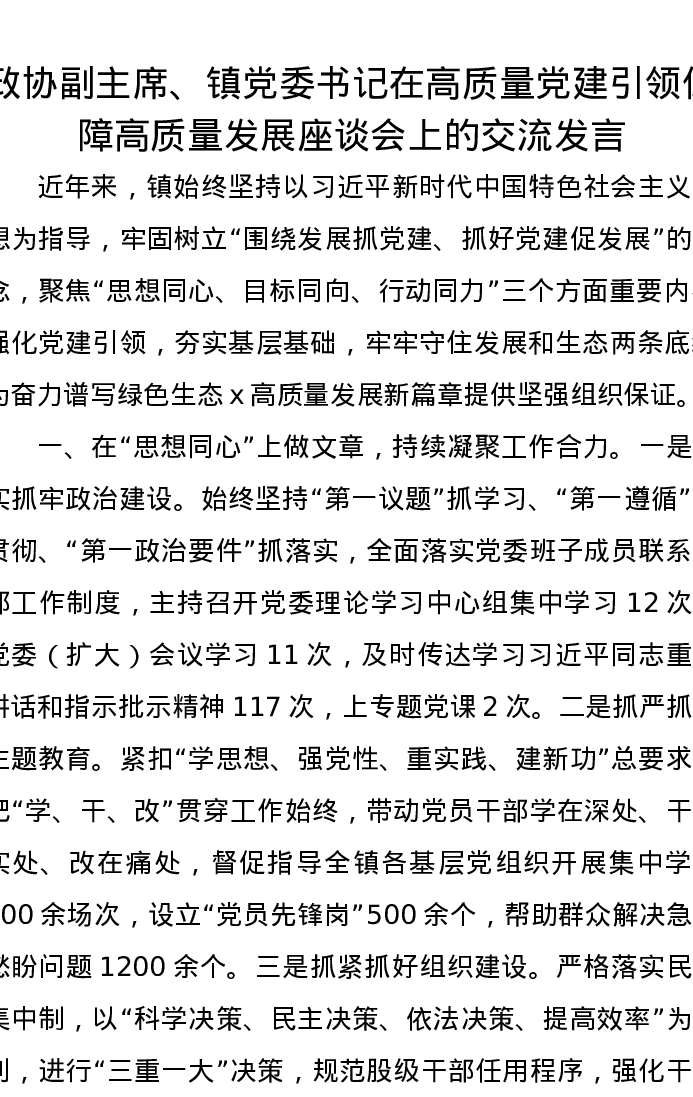 政协副主席、镇党委书记在高质量党建引领保障高质量发展座谈会上的交流发言