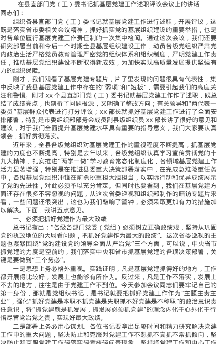 20220111在县直部门党(工)委书记抓基层党建工作述职评议会议上的讲话