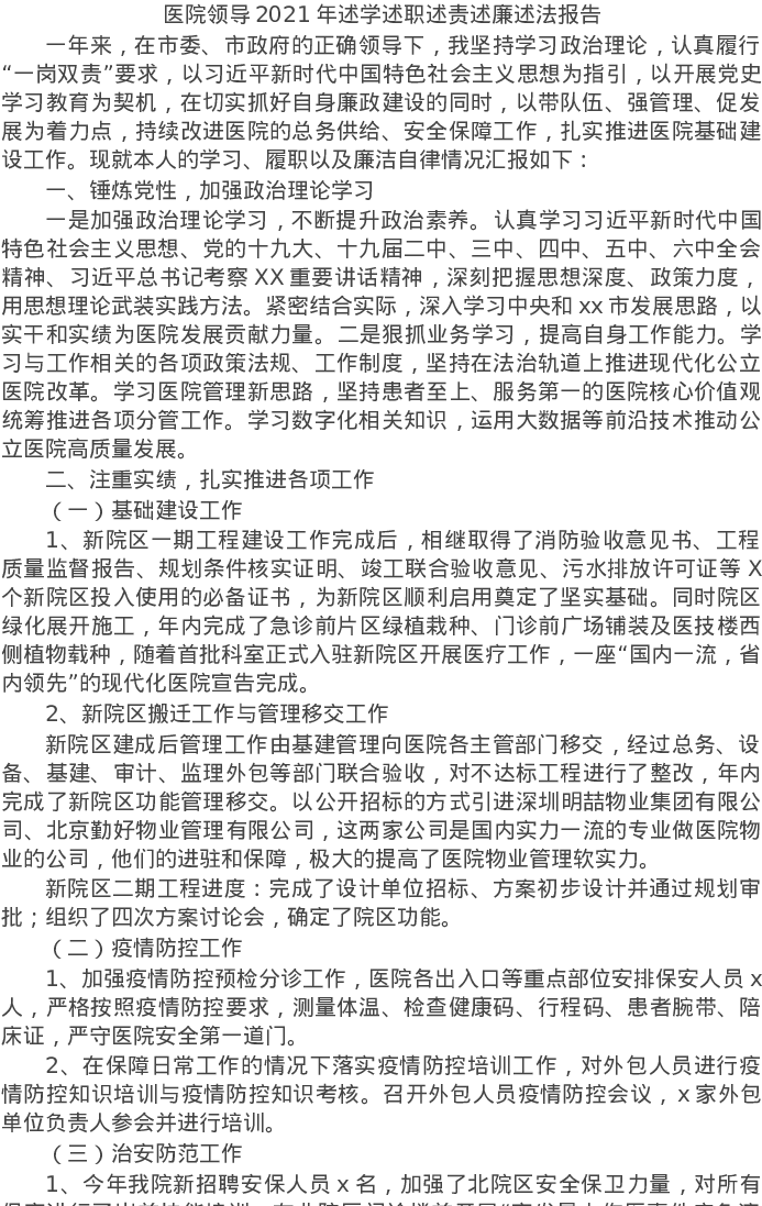 20220114医院领导2021年述学述职述责述廉述法报告