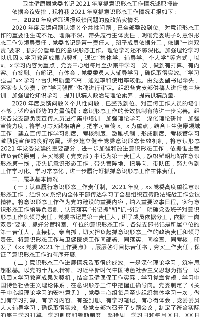 20220120卫生健康局党委书记2021年度抓意识形态工作情况述职报告