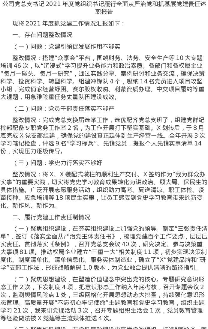 20220125公司党总支书记2021年度党组织书记履行全面从严治党和抓基层党建责任述职报告