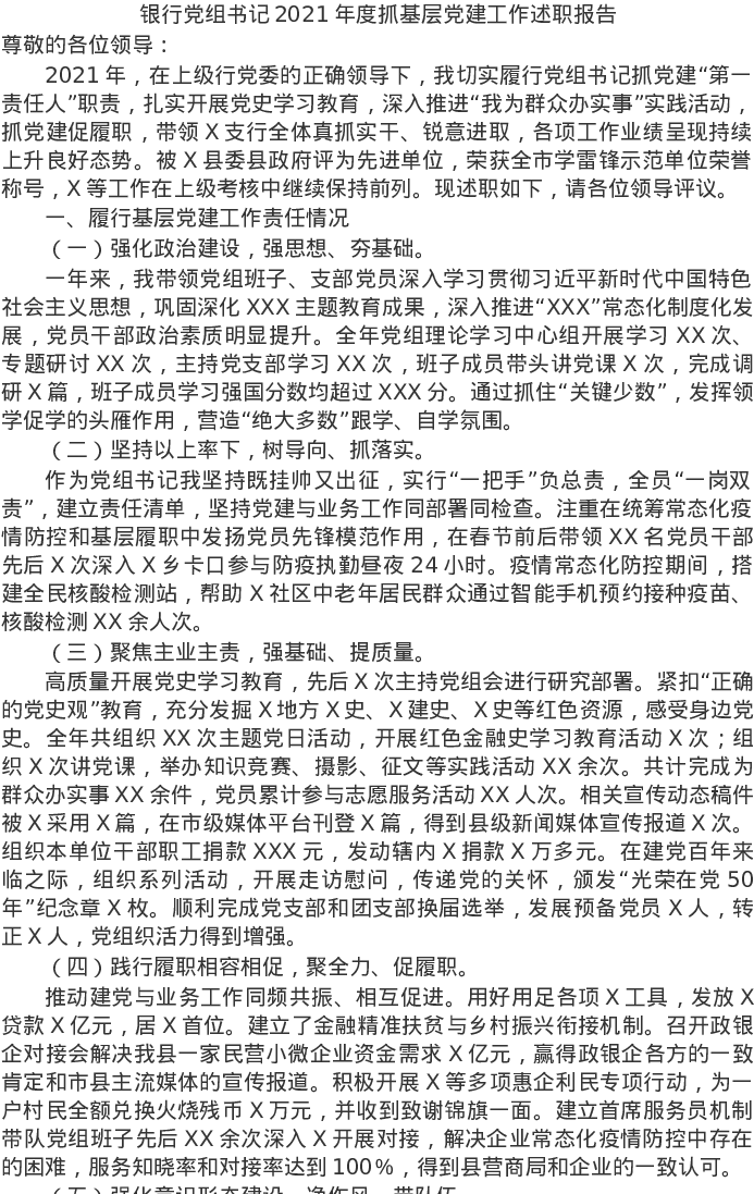 20220125银行党组书记2021年度抓基层党建工作述职报告