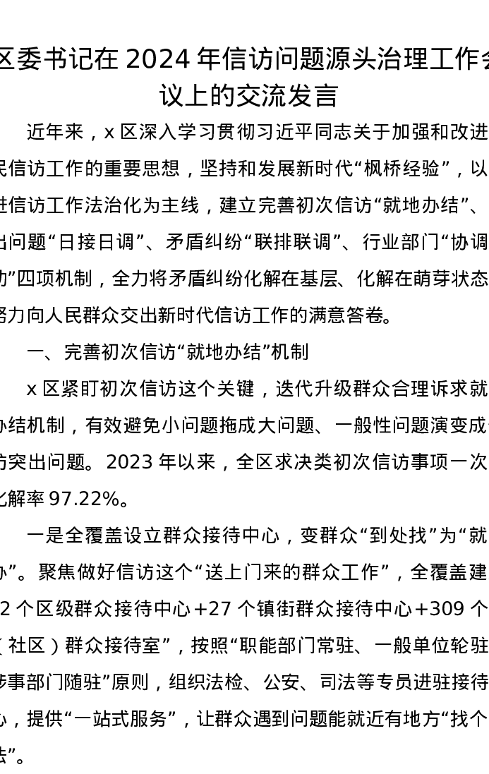 区委书记在2024年信访问题源头治理工作会议上的交流发言