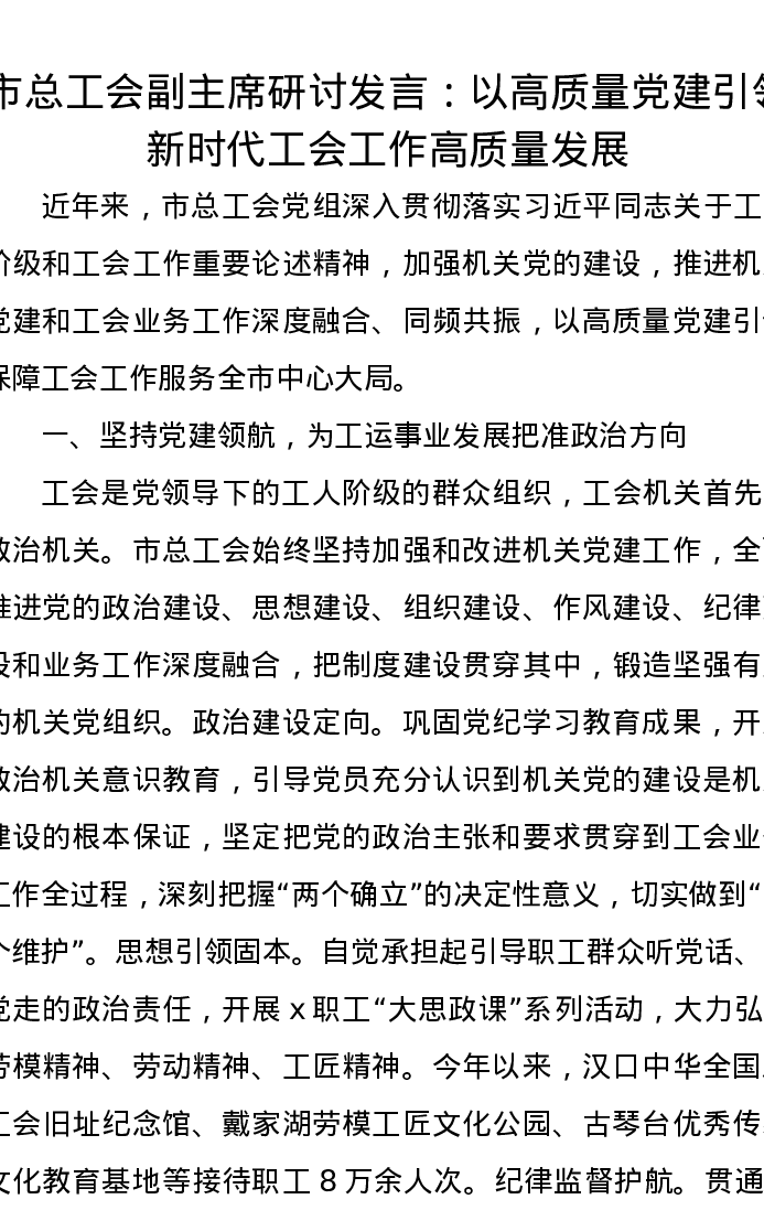 市总工会副主席研讨发言:以高质量党建引领新时代工会工作高质量发展