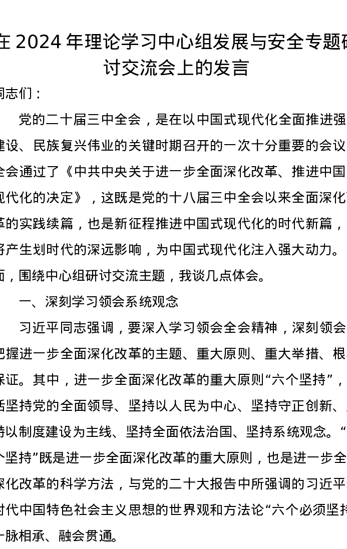 在2024年理论学习中心组发展与安全专题研讨交流会上的发言