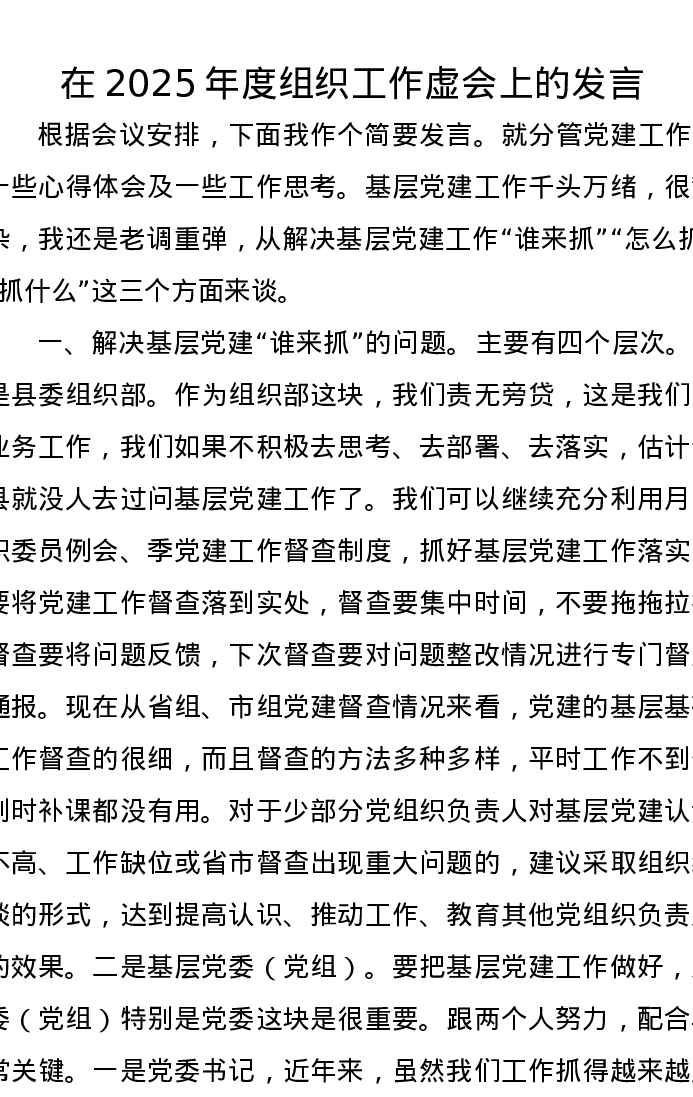 在2025年度组织工作虚会上的发言