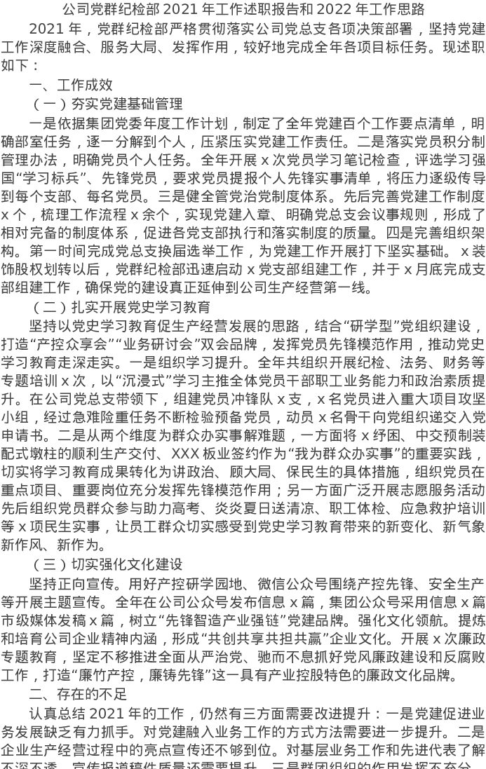 20220129公司党群纪检部2021年工作述职报告和2022年工作思路