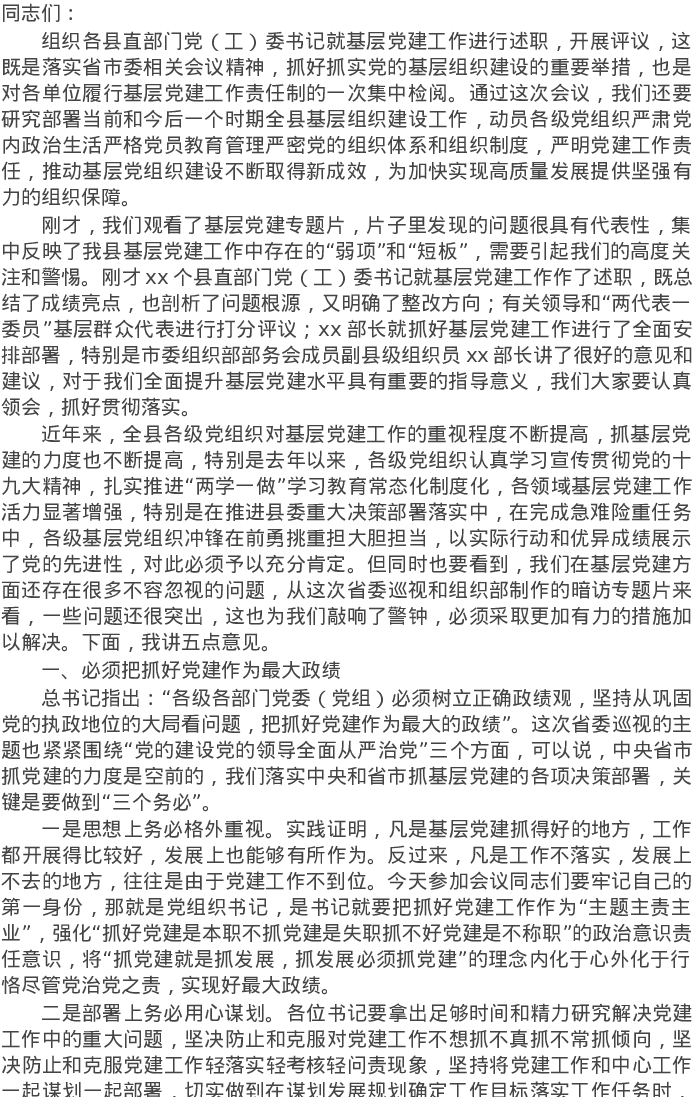 20220210在县直部门党(工)委书记抓基层党建工作述职评议会议上的讲话