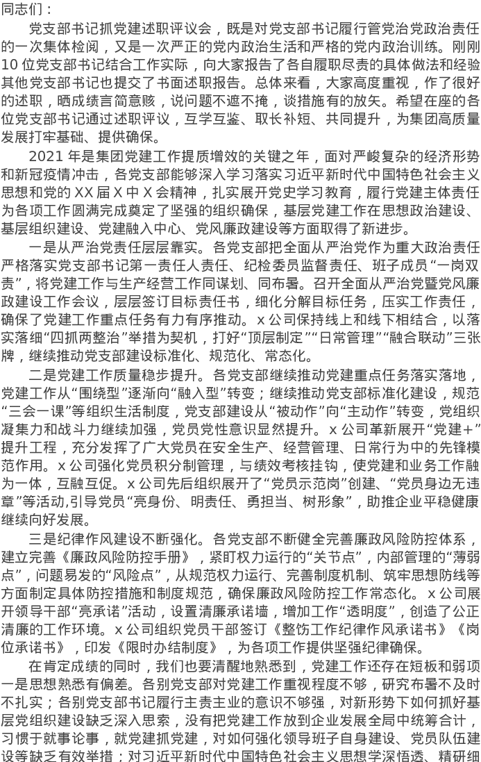 20220224集团党支部书记在2021年抓党建工作述职评议会上的总结点评讲话