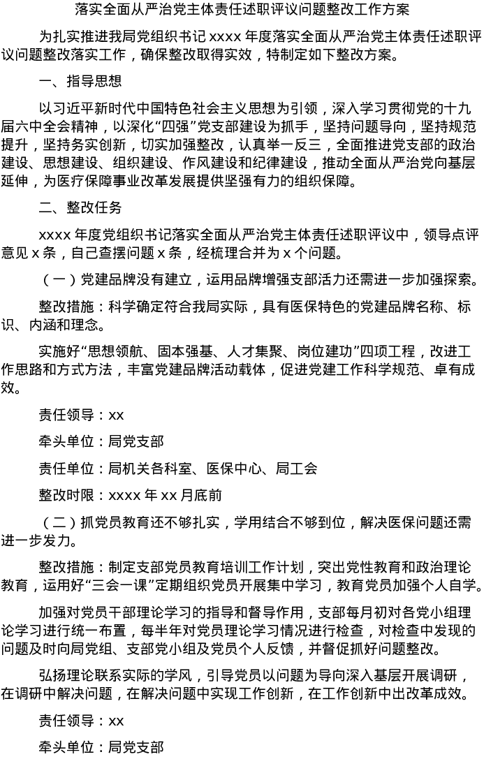 20220401落实全面从严治党主体责任述职评议问题整改工作方案