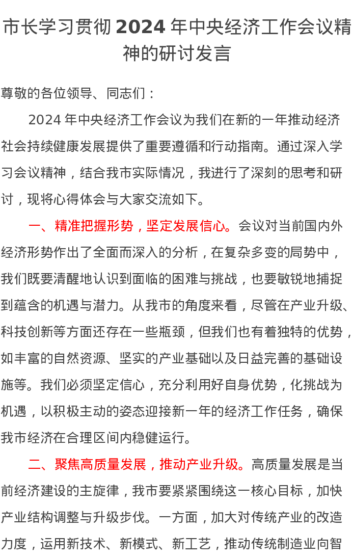 市长学习贯彻2024年中央经济工作会议精神的研讨发言