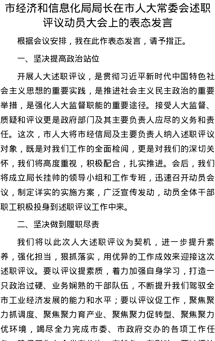 20220823市经济和信息化局局长在市人大常委会述职评议动员大会上的表态发言