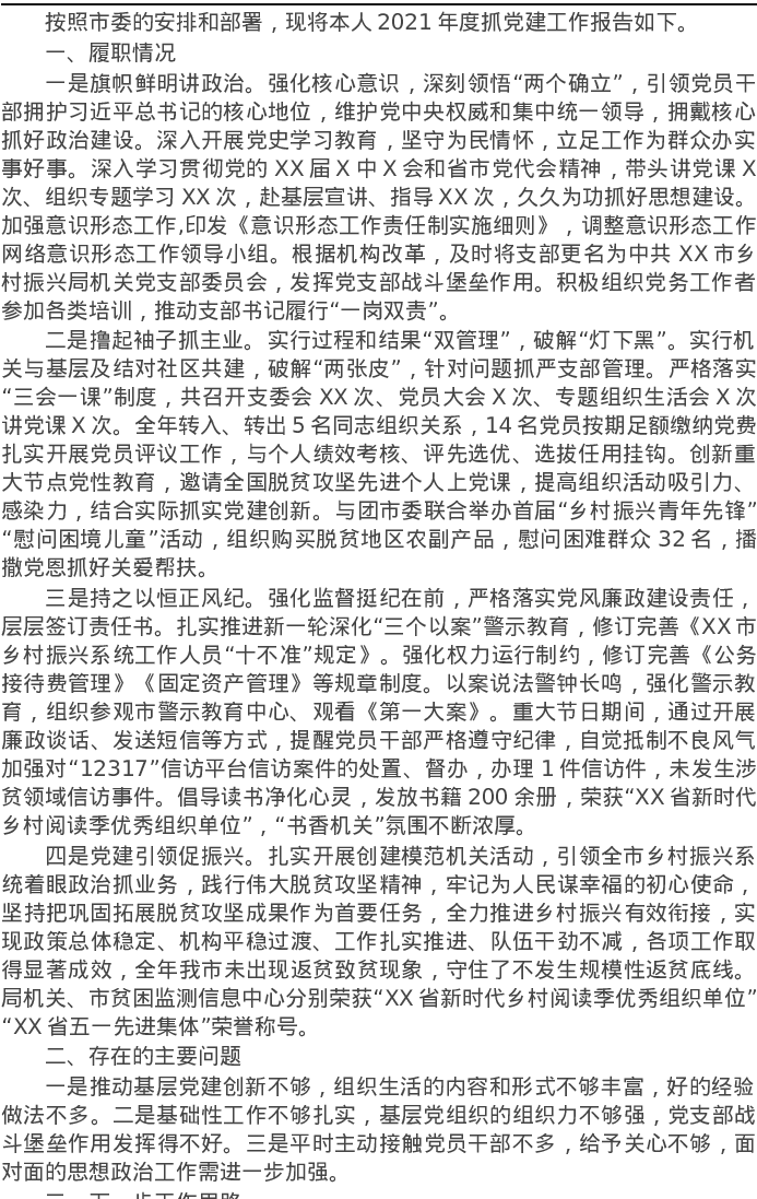 市乡村振兴局党支部书记2021年度抓基层党建工作述职报告