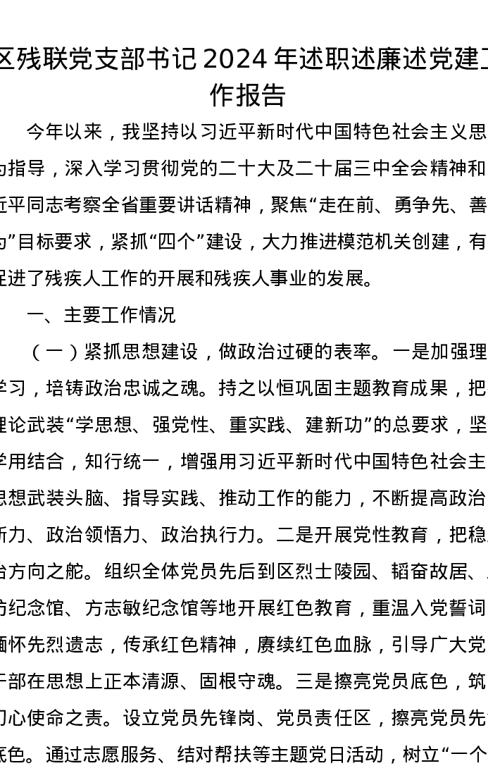 区残联党支部书记2024年述职述廉述党建工作报告
