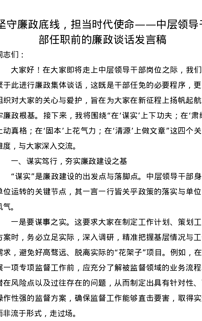 坚守廉政底线,担当时代使命——中层领导干部任职前的廉政谈话发言稿