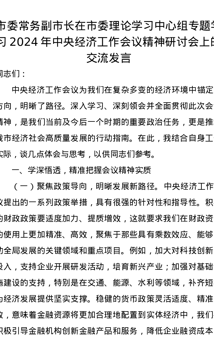 市委常务副市长在市委理论学习中心组专题学习2024年中央经济工作会议精神研讨会上的交流发言