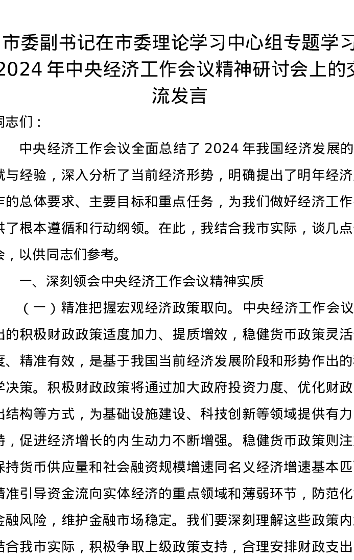 市委副书记在市委理论学习中心组专题学习2024年中央经济工作会议精神研讨会上的交流发言