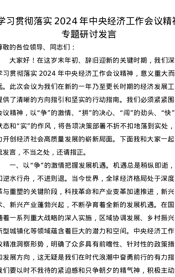 学习贯彻落实2024年中央经济工作会议精神专题研讨发言