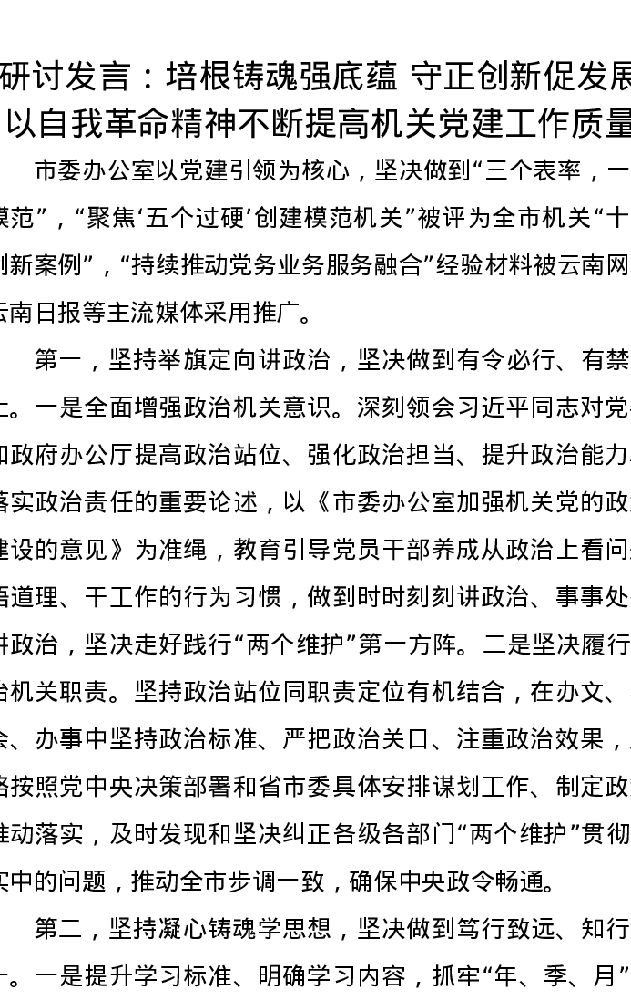研讨发言:培根铸魂强底蕴 守正创新促发展 以自我革命精神不断提高机关党建工作质量