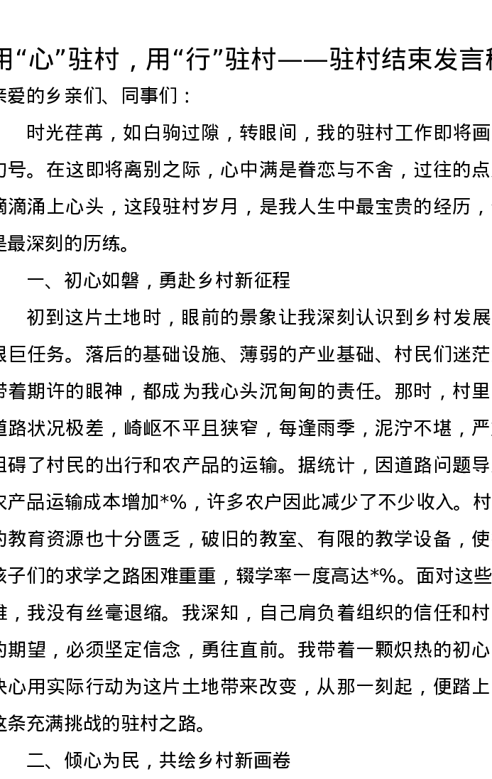 用“心”驻村,用“行”驻村——驻村结束发言稿