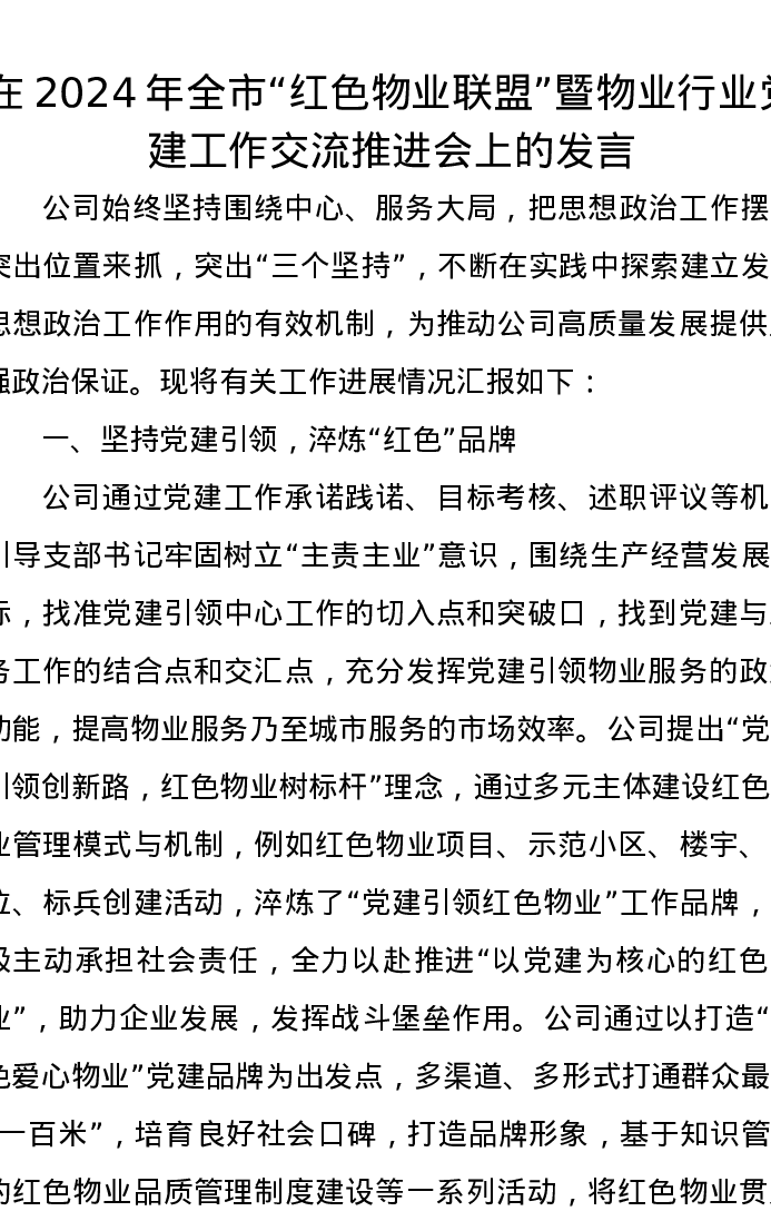 在2024年全市“红色物业联盟”暨物业行业党建工作交流推进会上的发言
