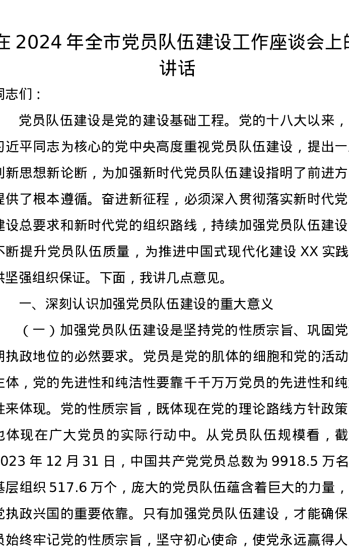 在2024年全市党员队伍建设工作座谈会上的讲话