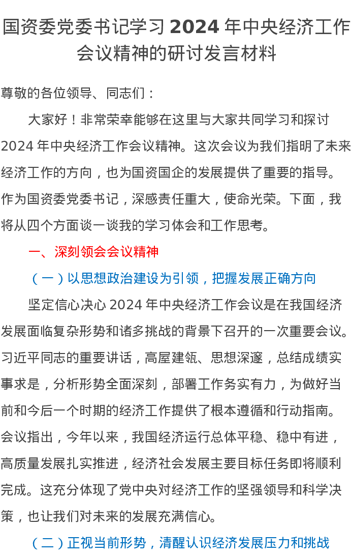 国资委党委书记学习2024年中央经济工作会议精神的研讨发言材料