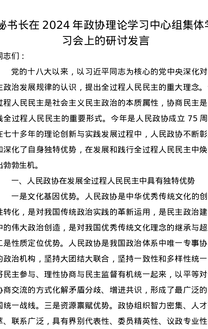 秘书长在2024年政协理论学习中心组集体学习会上的研讨发言