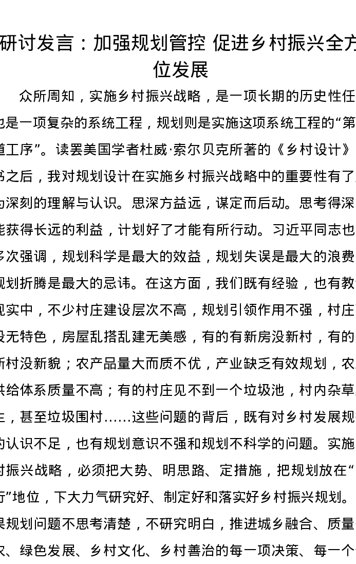 研讨发言:加强规划管控促进乡村振兴全方位发展