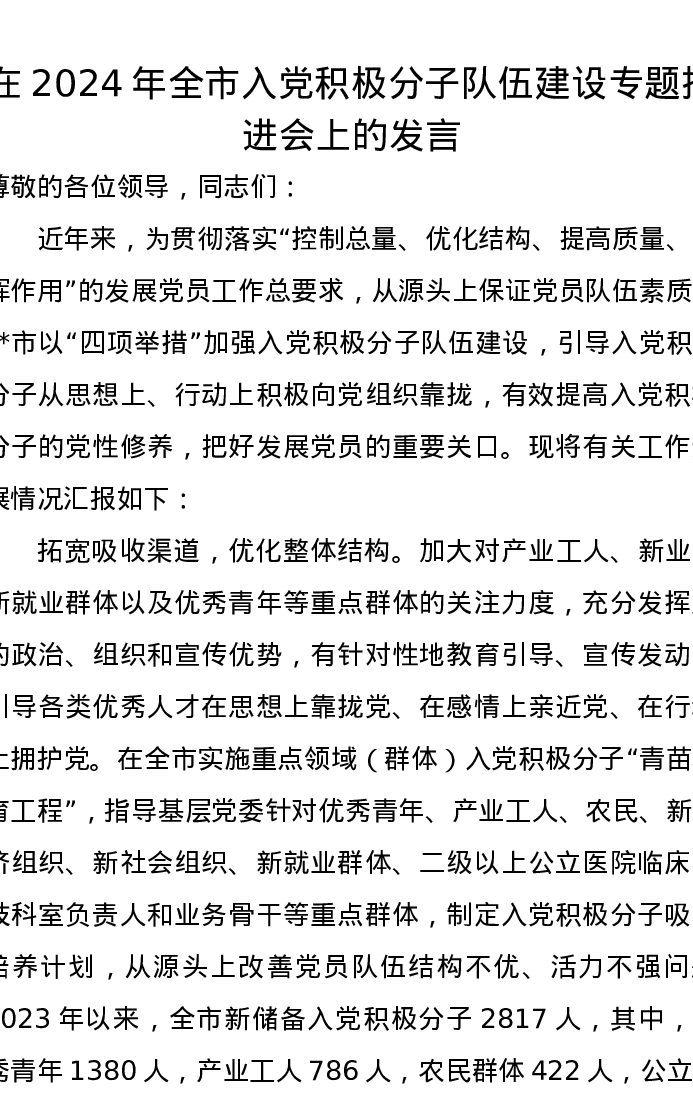在2024年全市入党积极分子队伍建设专题推进会上的发言