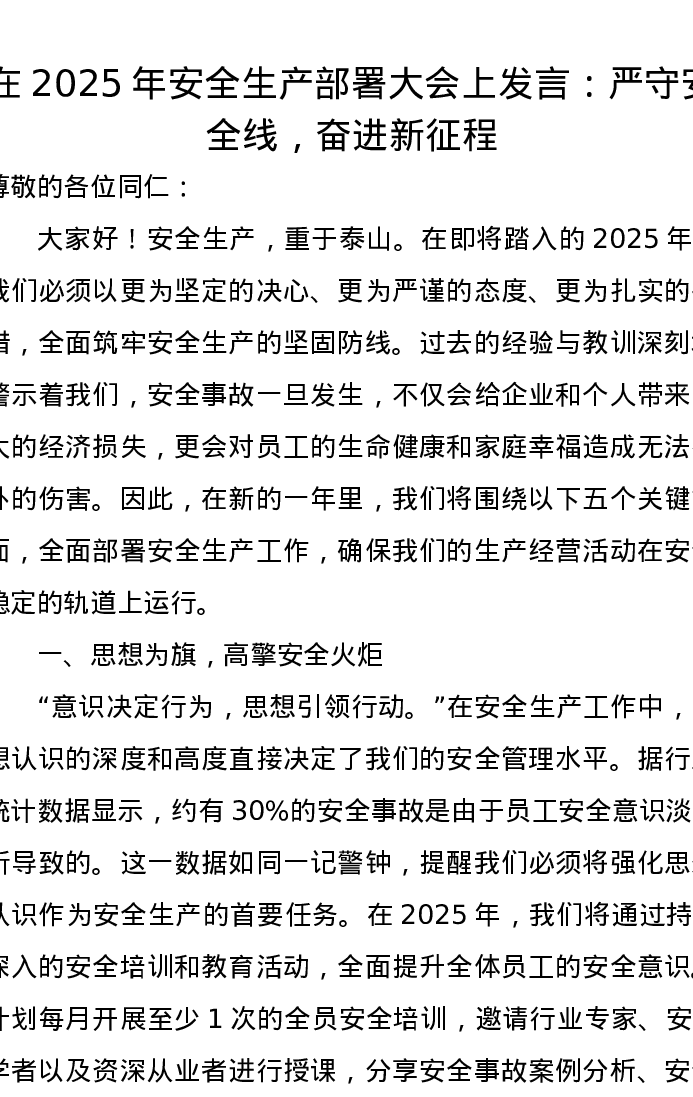 在2025年安全生产部署大会上发言:严守安全线,奋进新征程