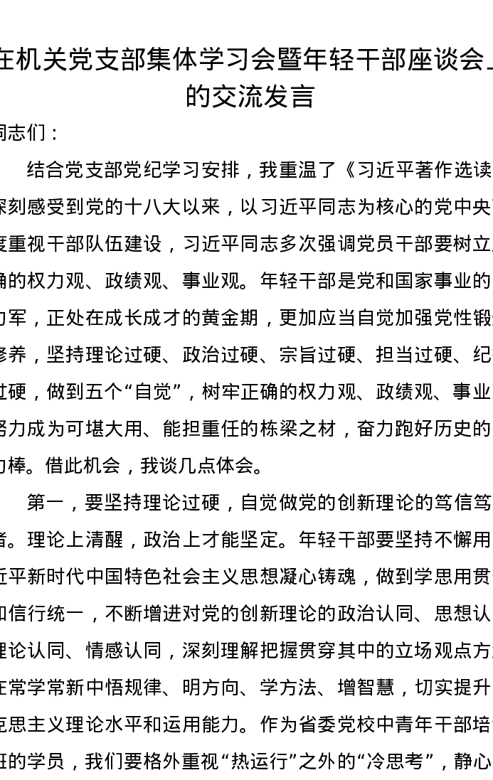 在机关党支部集体学习会暨年轻干部座谈会上的交流发言